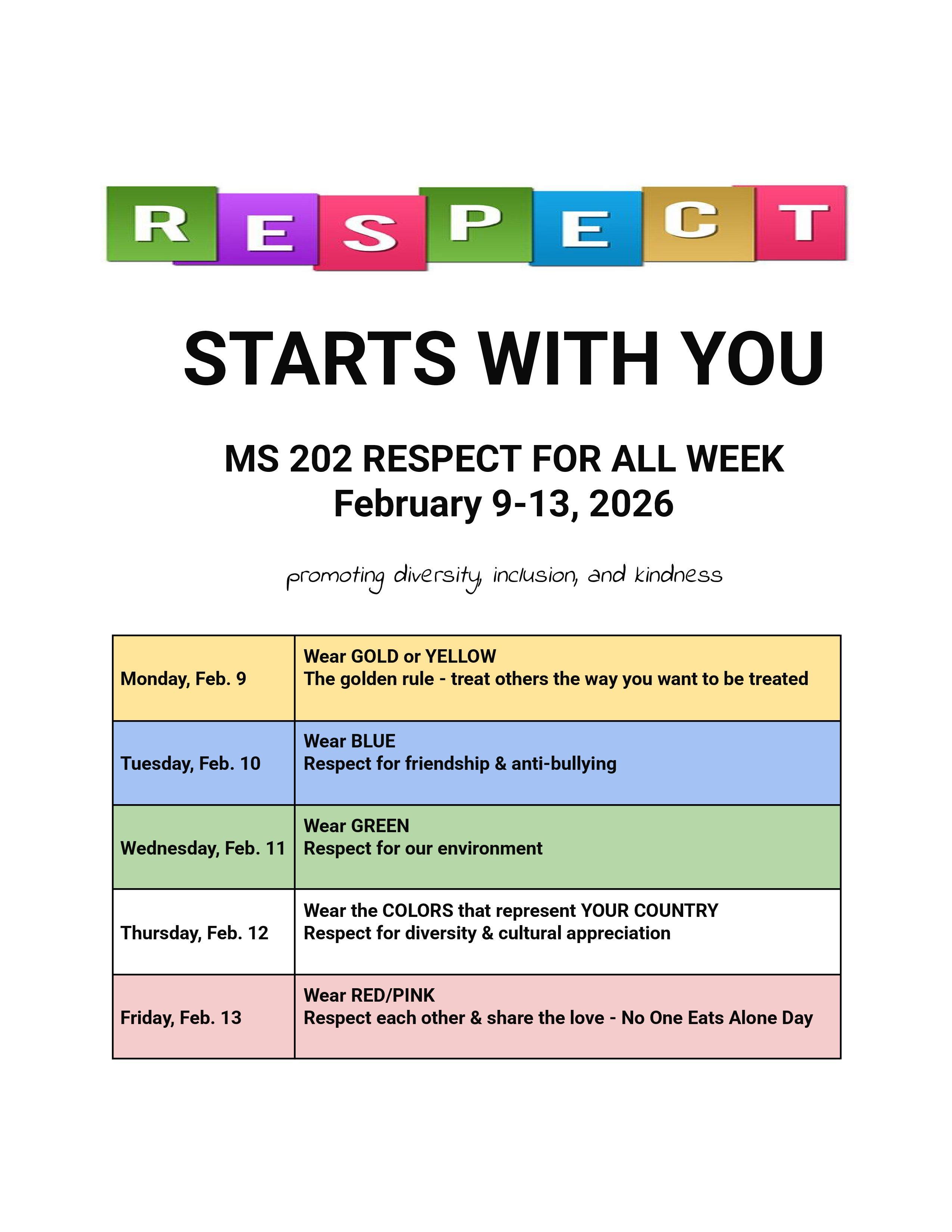 MS202 will celebrate Respect for All Week - February 9 -13, 2026. Wear a different color each day to help promote diversity, inclusion and kindness.